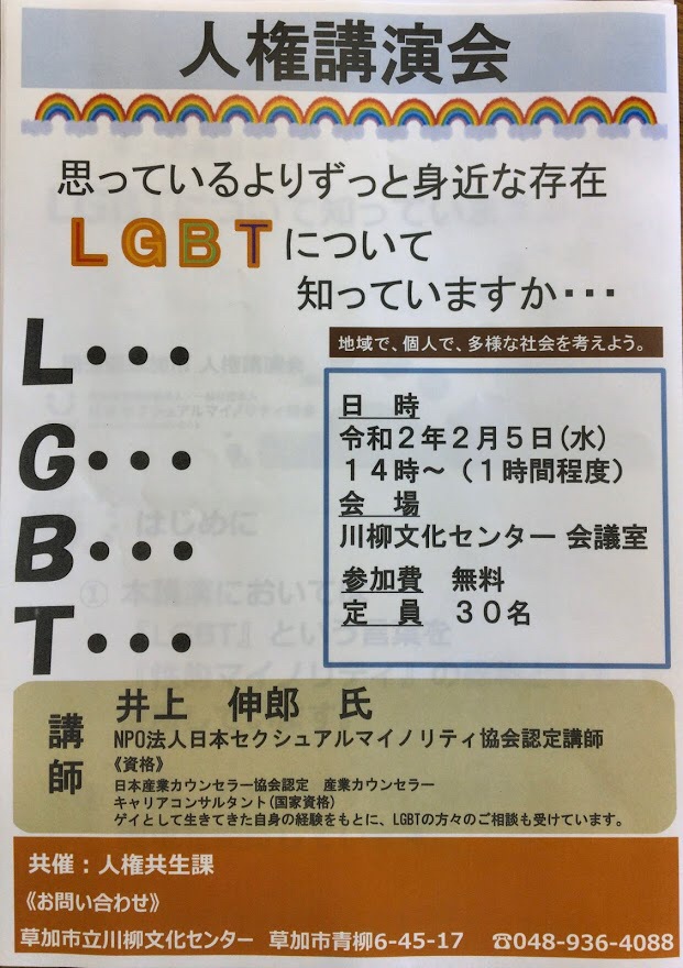 人権講演会の一環として、「思っているよりずっと身近な存在 LGBTについて知っていますか」というテーマで、草加市民を対象とした約1時間の講演でした。